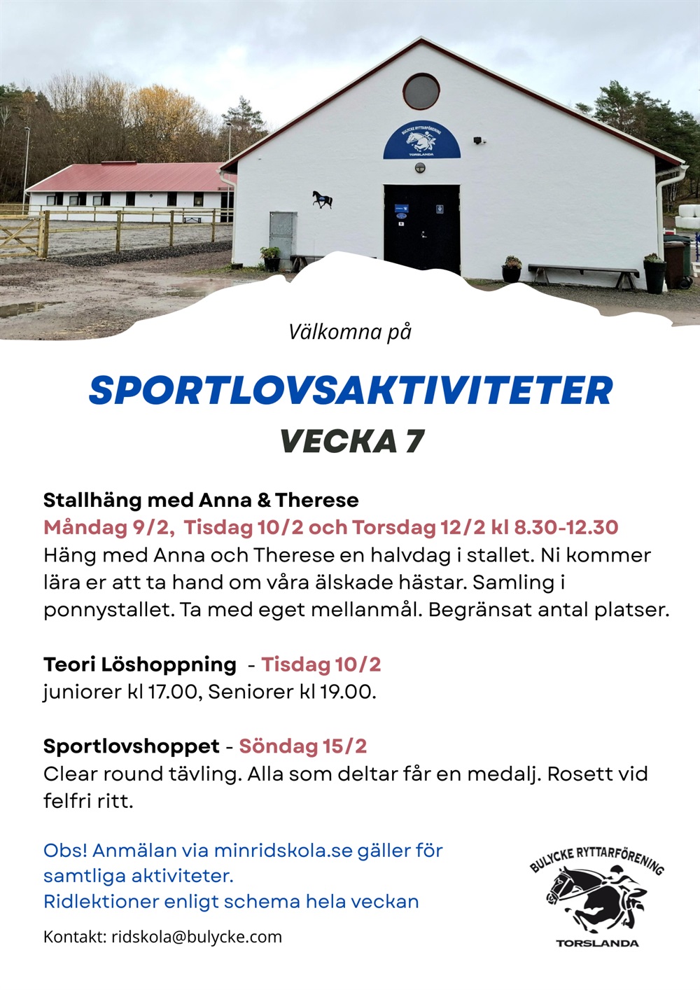 Nytt för den här terminen är att vi gärna vill att ni anmäler er via Min Ridskola. Detta för att personalen ska kunna planera teorin på bästa...