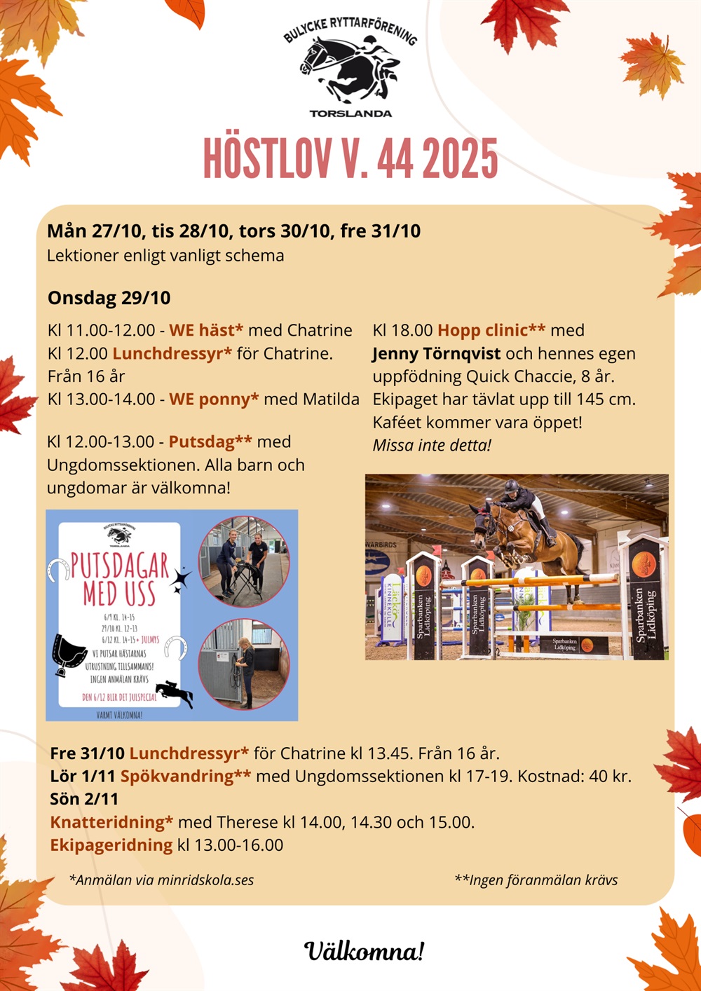 På höstlovet vecka 44 har vi lektioner som vanligt men vi erbjuder också andra spännande saker som t.ex: